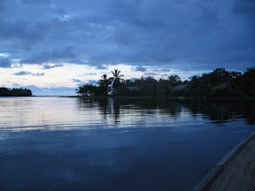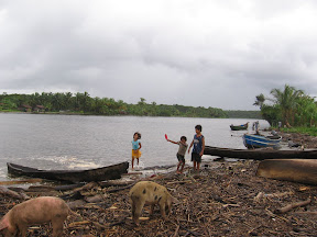 Je vais vous conter mon aventure dans la communaute de Corn River alias Rio Mais. Je suis parti en dori [nom creole pour cayuco...pirogue en fait]. Alors on avait un dori avec un moteur de 25CV donc on a mis 5h to reach [pour aller la bas]. C est un village situe a l embouchure de la fleuve Rio Mais en fait. Il y a des cabanes de chaque cote du fleuve.